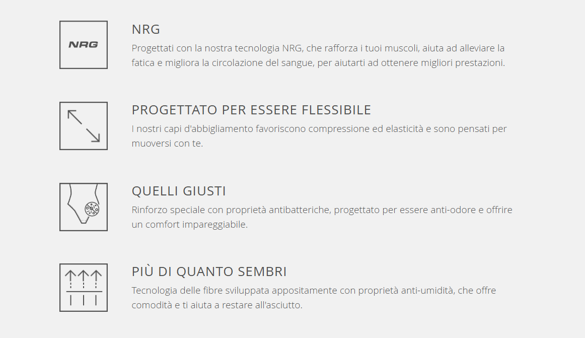 • I nostri capi d'abbigliamento favoriscono compressione ed elasticità e sono pensati per muoversi con te.