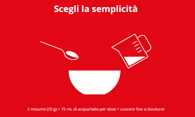Consigli per l'uso: Per ogni pancake, mescolare 2 misurini (25g) con 75mL di acqua in una ciotola. Versare il composto in una padella ben oliata e cuocere a fuoco medio. Attendere 1-2 minuti prima di girare il pancake. Lasciare cuocere entrambi i lati fino a doratura. Il misurino è all'interno della confezione.
